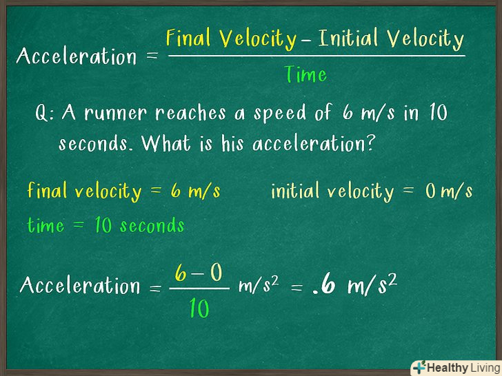 Знайдіть прискорення об'єкта.якщо ви хочете знайти силу об'єкта, ви можете обчислити його прискорення, знаючи масу. Все, що вам потрібно зробити – це скористатися формулою для знаходження прискорення об'єкта.[4]Формула має вигляд (прискорення = кінцева швидкість-Початкова швидкість)/час.- Приклад: бігун розвиває швидкість 6 м / с за десять секунд. Яке його прискорення?