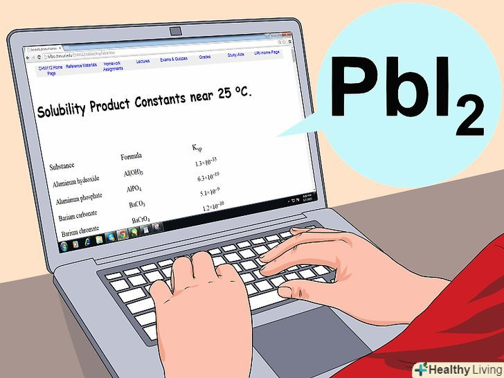 Знайдіть добуток розчинності ksp (це постійна величина). кожне з'єднання має свою константу Ksp. Її значення для різних речовин наведені в довідниках і на сайті (англійською мовою). Значення добутку розчинності визначаються експериментально і вони можуть значно відрізнятися один від одного в різних джерелах, тому краще користуватися таблицею для ksp у вашому підручнику хімії, якщо така таблиця там є. Якщо не вказано іншого, в більшості таблиць наводиться добуток розчинності при температурі 25ºC.- Наприклад, якщо ви розчиняєте йодид свинцю PbI2, знайдіть для нього добуток розчинності. На сайті bilbo.chm.uri.edu вказано значення 7,1 x 10-9.