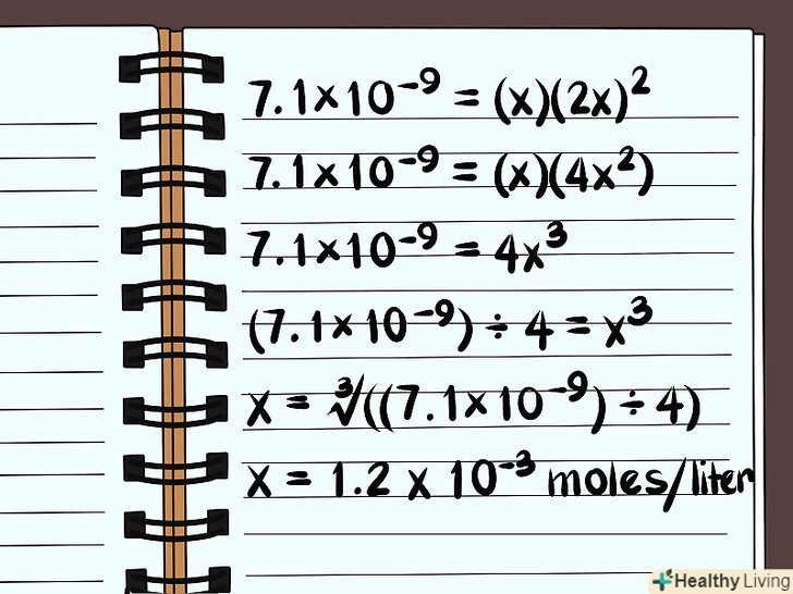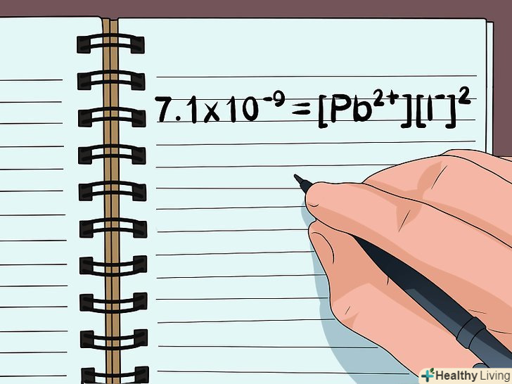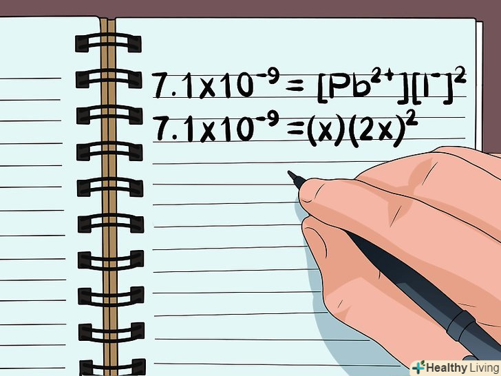 Перетворіть рівняння так, щоб вирішити його.перепишіть рівняння в простому алгебраїчному вигляді. Використовуйте при цьому те, що вам відомо про кількість молекул і іонів. Підставте замість числа атомів розчиняється з'єднання невідому величину х і висловіть кількість іонів через х.- У нашому прикладі необхідно переписати наступне рівняння: 7,1 x 10-9 = [Pb2+][I-]2.