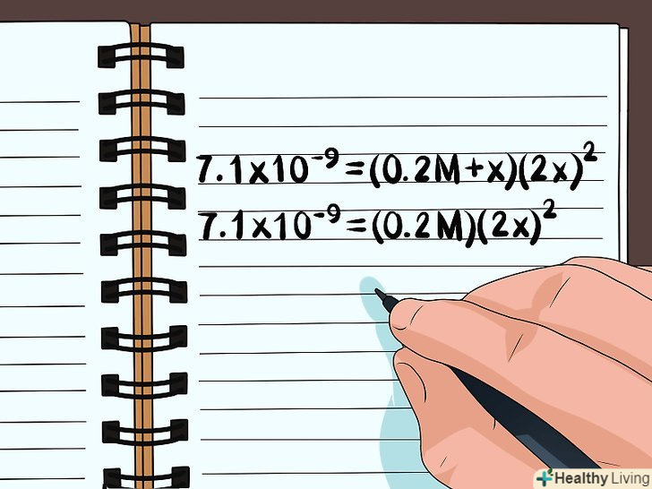 При необхідності врахуйте загальні іони.пропустіть цей крок, якщо речовина розчиняється в чистій воді. Однак якщо ви використовуєте розчин, який вже містить один або більше цікавлять вас іонів (загальних іонів), розчинність може значно знизитися.[4] ефект загальних іонів особливо помітний для слабо розчинних речовин, і в подібних випадках можна припускати, що переважна більшість розчинених іонів вже були присутні в розчині раніше. Перепишіть рівняння і врахуйте в ньому відомі молярні концентрації (молей на літр, або M) вже розчинених іонів. Відкоригуйте невідомі величини х для цих іонів.[5]- Наприклад, якщо йодид свинцю вже присутній в розчині з концентрацією 0,2 M, слід переписати рівняння наступним чином: 7,1 x 10-9 = (0,2 M+x)(2x)2. Оскільки величина 0,2 M набагато більше x, можна записати рівняння у вигляді 7,1 x 10-9 = (0,2 M) (2x)2.