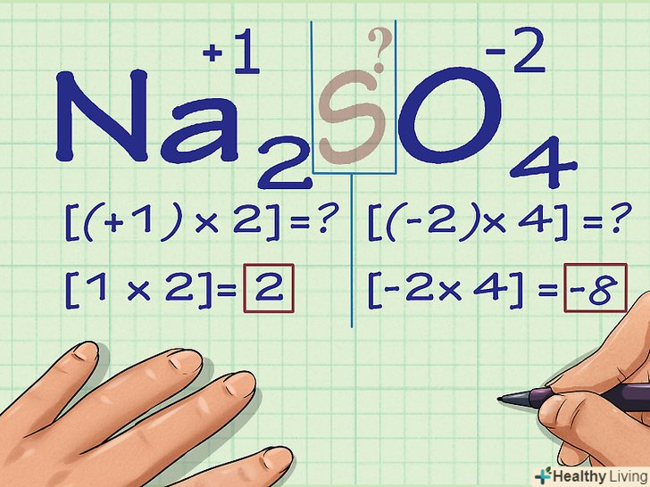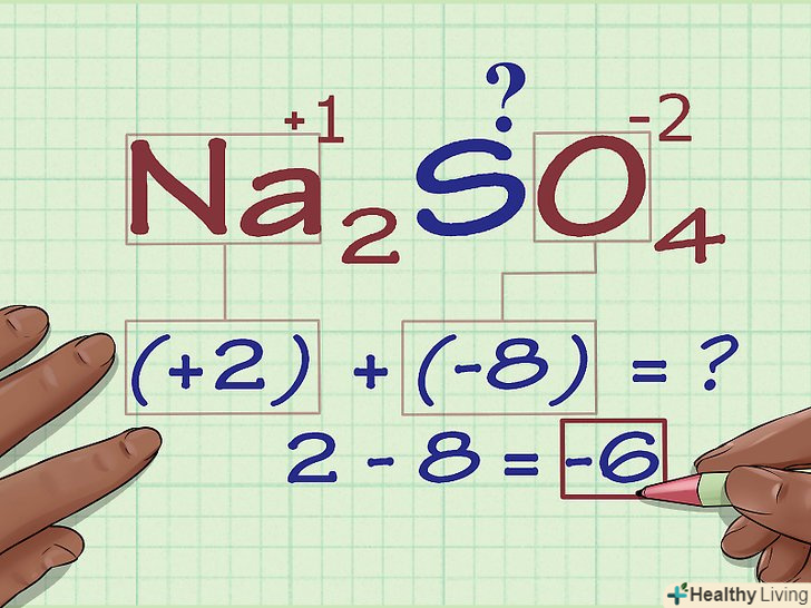 Складіть попередні результати.підсумовуючи результати множення, отримуємо ступінь окислення з'єднання без обліку вкладу шуканого атома.- У нашому прикладі для na2SO4 ми складаємо 2 і -8 і отримуємо -6.
