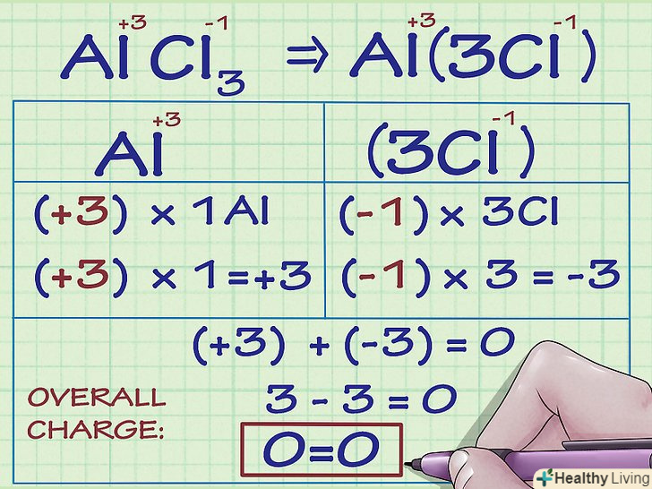 Врахуйте, що іони металів можуть мати кілька ступенів окислення.атоми багатьох металевих елементів можуть іонізуватися на різні величини. Наприклад, заряд іонів такого металу як залізо (Fe) дорівнює +2, або +3.[1] Заряд іонів металу (і їх ступінь окислення) можна визначити по зарядах іонів інших елементів, з якими даний метал входить до складу хімічної сполуки; в тексті цей заряд позначається римськими цифрами: так, залізо (III) має ступінь окислення +3.- Як приклад розглянемо з'єднання, що містить іон алюмінію. Загальний заряд з'єднання AlCl3 дорівнює нулю. Оскільки нам відомо, що іони Cl - мають заряд -1, і в з'єднанні міститься 3 таких іона, для загальної нейтральності розглянутого речовини іон Al повинен мати заряд +3. Таким чином, в даному випадку ступінь окислення алюмінію дорівнює +3.