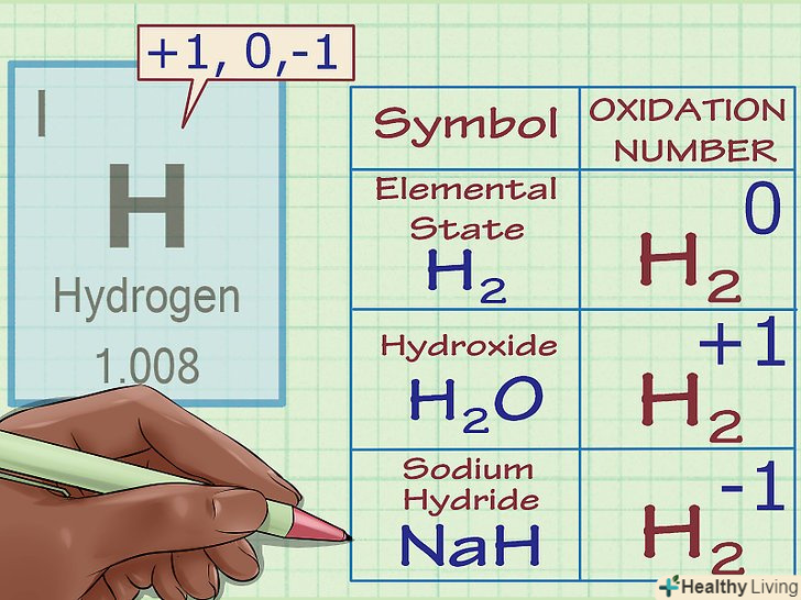 Водень характеризується ступенем окислення +1, за деякими винятками.як і для кисню, тут також існують винятки. Як правило, ступінь окислення водню дорівнює + 1 (якщо він не знаходиться в елементарному стані h2). Однак в з'єднаннях, званих гідридами, ступінь окислення водню становить -1.- Наприклад, в h2o ступінь окислення водню дорівнює +1, оскільки атом кисню має заряд -2, і для загальної нейтральності необхідні два заряди +1. Проте, в складі гідриду натрію ступінь окислення водню вже -1, так як іон na несе заряд +1, і для загальної електронейтральності заряд атома водню (а тим самим і його ступінь окислення) повинен дорівнювати -1.