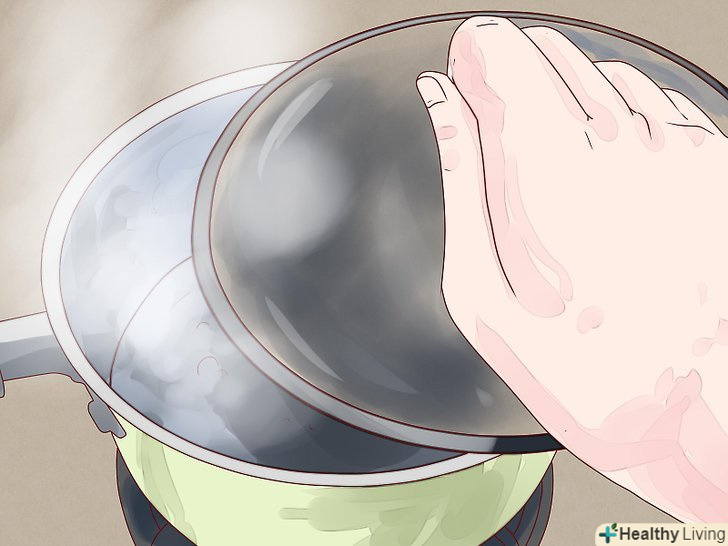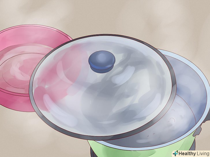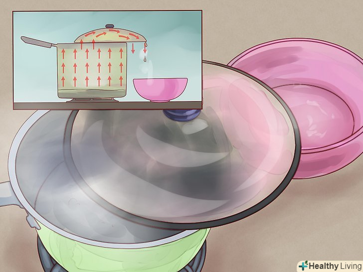 Прикрийте кухлик кришкою, але не повністю.далі, знайдіть кришку для свого ковшика (вона необов'язково повинна ідеально підходити). Покладіть кришку так, щоб якась її частина звисала з ковшика і перебувала нижче всіх інших частин. Спостерігайте за тим, як на кришці починає формуватися конденсат, а потім капати з неї.- У міру кипіння солоної води сама вода (без солі) буде перетворюватися в пар і підніматися з ковшика. Стикаючись з кришкою, пара буде злегка остуджувати і формувати рідкий конденсат (воду) на нижній частині кришки. Ця вода не містить сіль, так що все, що нам залишається – це зібрати очищену від солі воду.