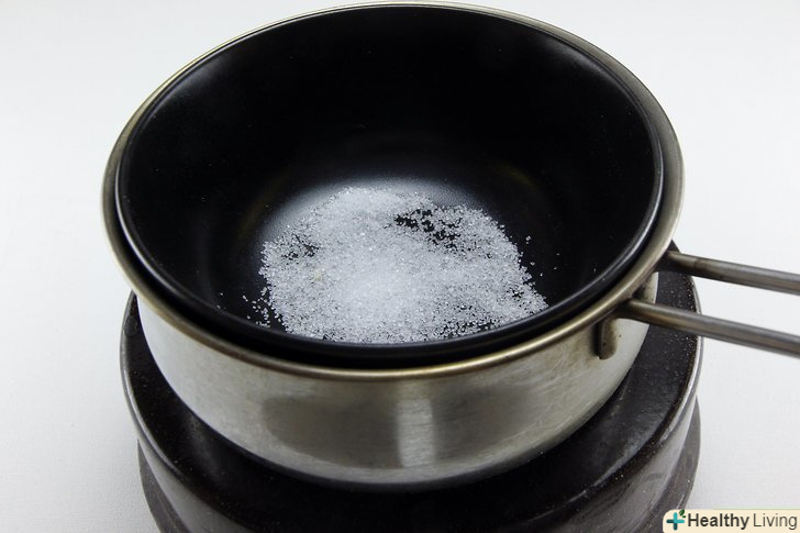 Перелийте спиртовий розчин цукру в скляну миску на каструлі.Увімкніть вентилятор або витяжку і надіньте респіратор, щоб не дихати парами спирту.[12]- Увімкніть нагрів лише після того, як переллєте спиртовий розчин цукру в миску. Виставте середній вогонь і доведіть воду до повільного кипіння. Спирт має високу летючість, і він буде повільно випаровуватися в паровій ванні. Інші методи можуть викликати іскру і загоряння спирту.