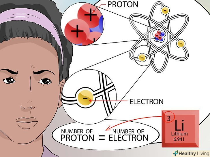 Порахуйте кількість електронів.Пам'ятайте, що частинки з протилежними зарядами притягуються. Електрони мають позитивний заряд і крутяться навколо атома. Кількість негативно заряджених електронів, які притягуються до ядра, залежить від кількості позитивно заряджених протонів в ядрі.- Оскільки сам атом володіє нейтральним зарядом, кількість частинок з негативним зарядом має дорівнювати кількості частинок з позитивним зарядом. З цієї причини кількість електронів дорівнює кількості протонів.[8]