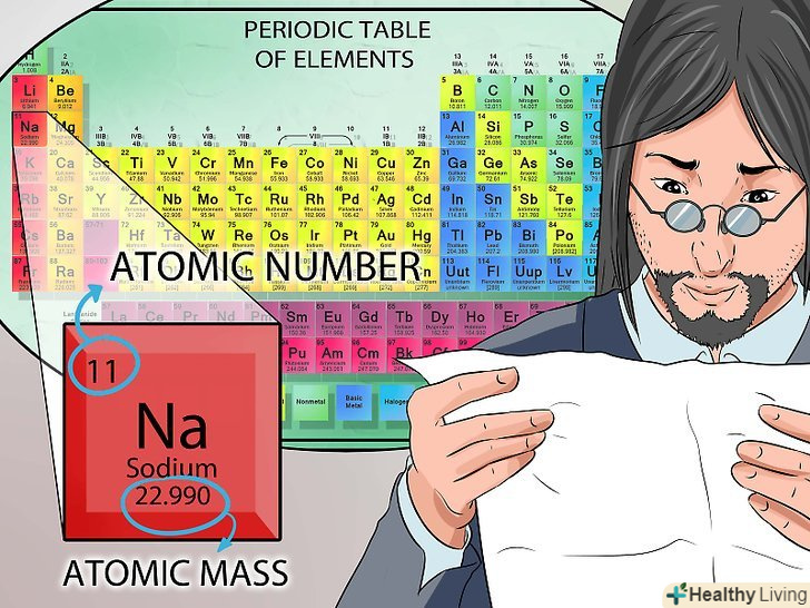 - Число під літерним символом-це атомна маса. Пам'ятайте, що атомна маса-це сума протонів і нейтронів в ядрі.[11]