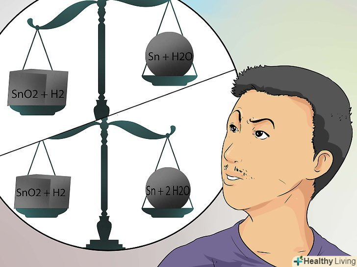 - На прикладі попереднього рівняння, SnO2 + H2 → Sn + H2O, подумаємо, чому така формула не буде працювати. Кількість Sn дорівнює з двох сторін, як і кількість H2, однак зліва дві частини кисню, а праворуч - лише одна.