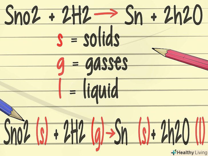 - Підставимо дві одиниці водню зліва і дві молекули води справа. У фінальній версії збалансоване рівняння виглядає так: SnO2 + 2 H2 → Sn + 2 H2O.[15]