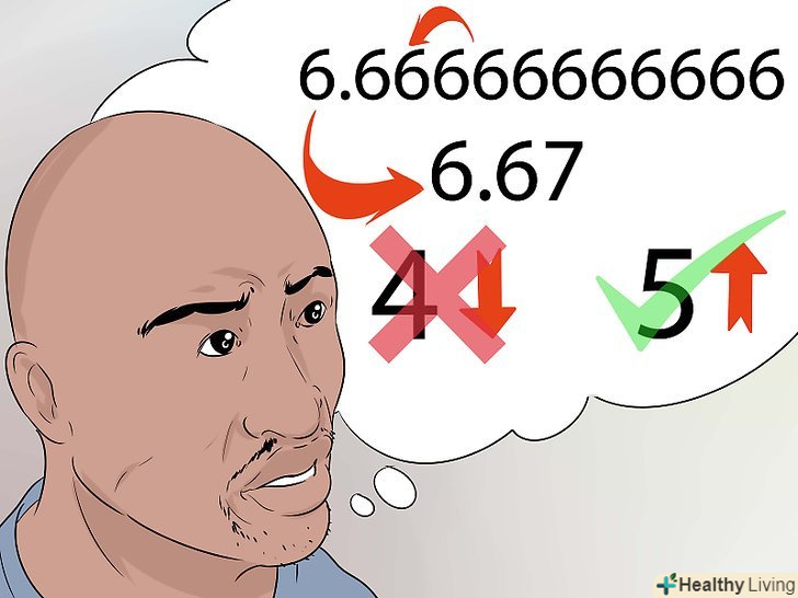 Не бійтеся округляти дуже довгі числа.у хімії часто округлюють, тому що нерідко відповіддю на рівняння служить число з великою кількістю цифр. Якщо в умові завдання дані інструкції по округленню, врахуйте їх.[20]- Знайте, як округляти. Якщо наступна цифра-це 4 або менше, слід округляти до меншого, якщо 5 і більше 5 - до більшого. Наприклад, перед вами число 6.66666666666666. У завданні сказано округлити відповідь до другої цифри після точки. Відповіддю буде 6.67.[21]