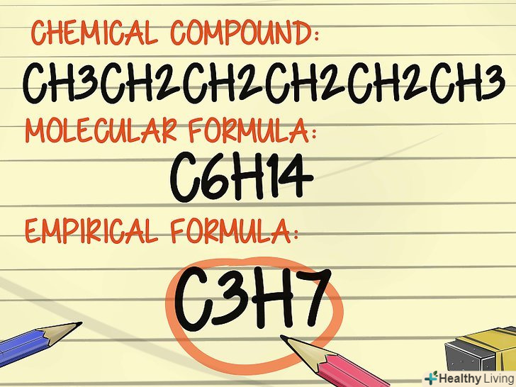 Знайте, що включається в молекулярну формулу.молекулярну формулу не потрібно доводити до найпростішої, або емпіричної, форми, оскільки в ній сказано, з чого саме складається молекула.- Молекулярна формула записується за допомогою абревіатур елементів і кількості атомів кожного елемента в молекулі.