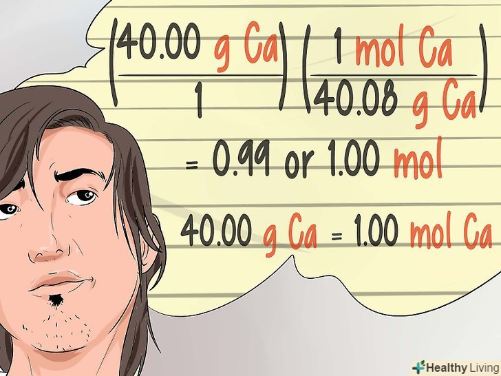 Пам'ятайте, що математика в хімії називається стехіометрією. ви зустрінете цей термін. Це опис того, як хімія виражається в математичних формулах. У хімічній математиці, або в стехіометрії, кількості елементів і хімічних сполук часто виражаються в молях, відсотках в молях, в молях на літр або в молях на кілограм.[30]- Вам потрібно буде переводити грами в молі. Атомна маса одиниці елемента в грамах дорівнює одному молю цієї речовини. Наприклад, атомна маса кальцію-40 одиниць атомної маси. Таким чином, 40 грамів кальцію дорівнюють одному молю кальцію.[31]