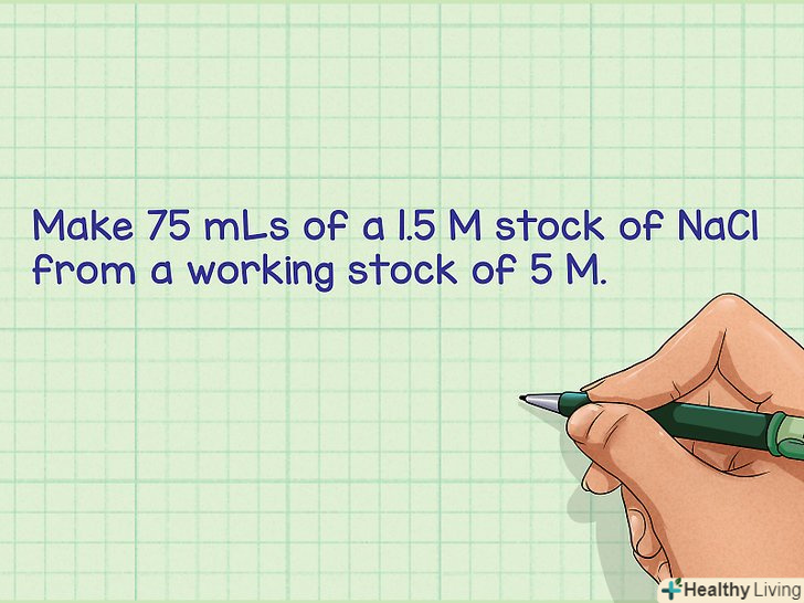 Визначте концентрацію кожного розчину.при розведенні розчинів необхідно знати концентрацію вихідного розчину і того розчину, який ви хочете отримати. Даний метод підходить для розведення концентрованих розчинів.[7]- Приклад: необхідно приготувати 75 мілілітрів розчину NaCl концентрації 1,5 M з розчину концентрації 5 M. вихідний розчин має концентрацію 5 M, і необхідно розбавити його до концентрації 1,5 M.