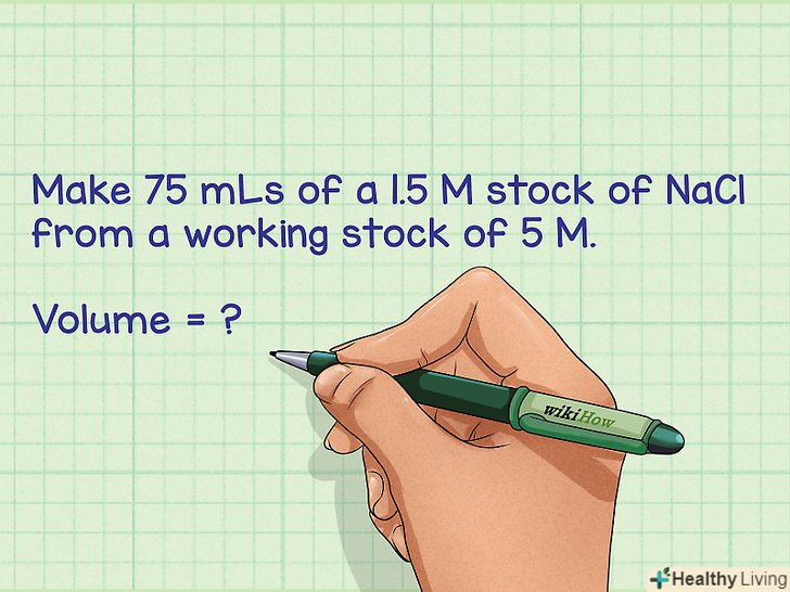 Визначте обсяг кінцевого розчину.необхідно знайти обсяг того розчину, який ви хочете отримати. Вам доведеться розрахувати кількість розчину, який буде потрібно, щоб розбавити даний розчин до отримання необхідних концентрації та обсягу.[8]- Приклад: необхідно приготувати 75 мілілітрів розчину NaCl концентрації 1,5 M з початкового розчину концентрації 5 M. У цьому прикладі кінцевий обсяг розчину становить 75 мілілітрів.