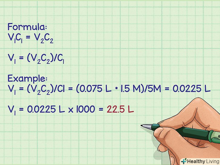 Розрахуйте обсяг розчину, який знадобиться для розведення початкового розчину. для цього вам знадобиться наступна формула: V1C1=V2C2, де V1 — обсяг необхідного розчину, C1 — його концентрація, V2 — обсяг кінцевого розчину, C2 — його концентрація.[9]- Щоб розрахувати обсяг необхідної рідини, необхідно переписати рівність відносно V1: V1 = (V2C2)/C1.