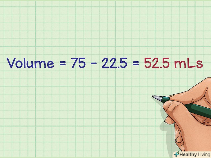 Віднімемо обсяг вихідного розчину з планованого кінцевого обсягу.в результаті розведення розчину необхідно отримати фіксований кінцевий обсяг. Щоб визначити обсяг розбавляючого розчину, відніміть з кінцевого обсягу обсяг вихідного розчину.- Приклад: кінцевий обсяг становить 75 мілілітрів, а вихідний обсяг дорівнює 22,5 мілілітра. Таким чином, отримуємо 75-22,5 = 52,5 мілілітра. Саме такий обсяг рідини знадобиться для розведення розчину.