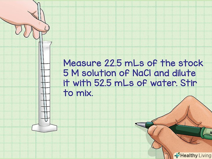 Змішайте розраховану кількість вихідного розчину з розбавляючою рідиною.за допомогою мензурки (інструмент для вимірювання об'єму рідини) відміряйте необхідну кількість вихідного розчину і змішайте його з необхідним об'ємом розбавляючої рідини.- Приклад: відміряйте 22,5 мілілітра вихідного розчину NaCl концентрації 5 M і розбавте його 52,5 мілілітрами води. Перемішайте розчин.