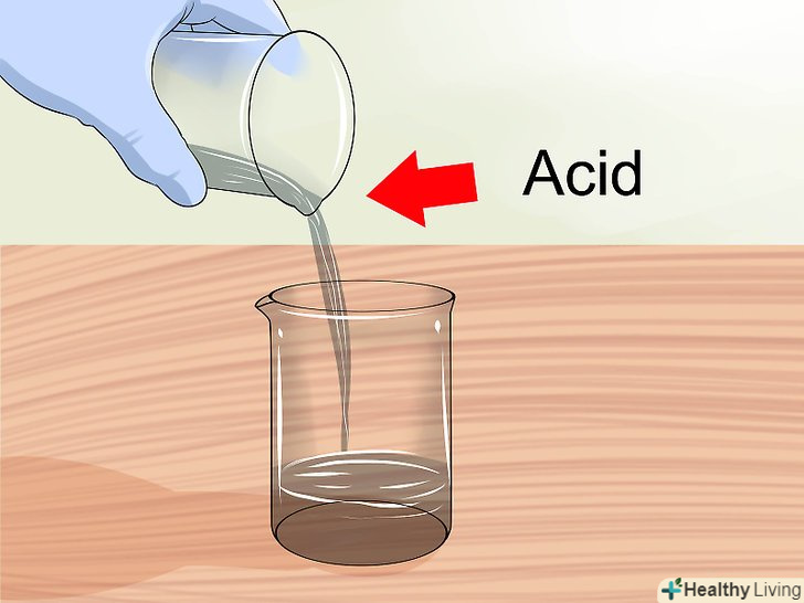 Додайте кислоту у воду.при розведенні концентрованих кислот завжди додавайте кислоту в воду. При змішуванні води і кислоти відбувається екзотермічна (з виділенням теплоти) реакція, що може привести до вибуху в тому випадку, якщо додавати воду в кислоту, а не навпаки.[10]- Згадуйте заходи безпеки кожен раз, коли вам належить працювати з кислотами.