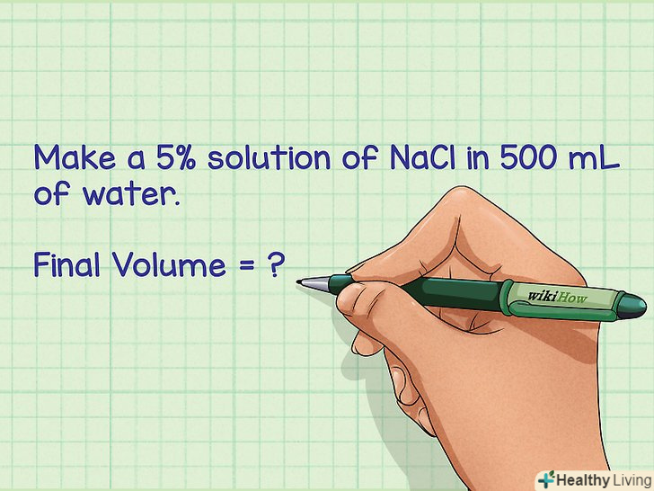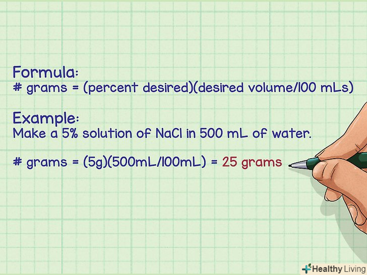 Розрахуйте кількість грамів речовини, яка потрібна для приготування розчину. щоб обчислити необхідну кількість грамів, використовуйте наступну формулу: число грамів = (необхідні відсотки) (необхідний обсяг/100 мл). При цьому необхідні відсотки виражаються в грамах, а необхідний обсяг — в мілілітрах.[2]- Приклад: необхідно приготувати 5-відсотковий розчин NaCl об'ємом 500 мілілітрів.