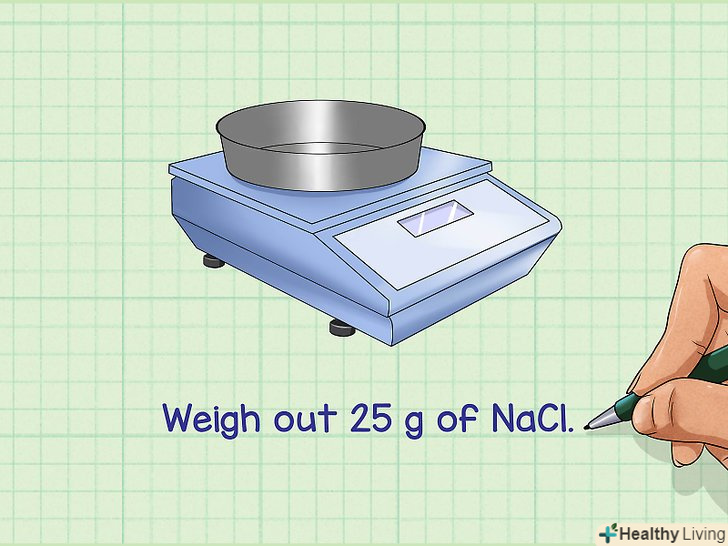 - Якщо NaCl дано у вигляді розчину, просто візьміть 25 мілілітрів NaCl замість кількості грамів порошку і відніміть цей обсяг з кінцевого обсягу: 25 мілілітрів NaCl на 475 мілілітрів води.