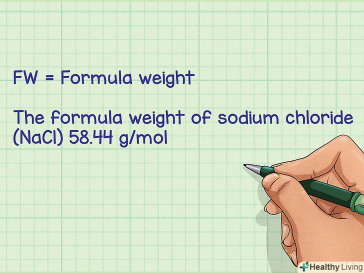 Визначте молекулярну вагу використовуваної речовини за формулою.Молекулярна вага за формулою (або просто молекулярна вага) сполуки записується в грамах на моль (г / моль) на стінці пляшки. Якщо ви не можете знайти на пляшці молекулярну вагу, пошукайте його в Інтернеті.[4]- Молекулярна вага речовини являє собою масу (в грамах) одного моля цієї речовини.