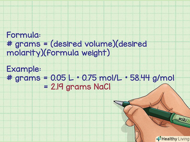 Розрахуйте число грамів, необхідне для приготування необхідного молекулярного розчину.для цього слід використовувати наступну формулу: число грамів = (необхідний обсяг)(необхідна молярність)(молекулярна вага за формулою). Пам'ятайте, що необхідний обсяг виражається в літрах, молярність — в молях на літр, а молекулярна вага за формулою — в грамах на моль.[6]- Приклад: якщо ви хочете приготувати 50 мілілітрів розчину з мольною часткою NaCl 0,75 (молекулярна вага за формулою: 58,44 г/моль), слід розрахувати кількість грамів NaCl.
