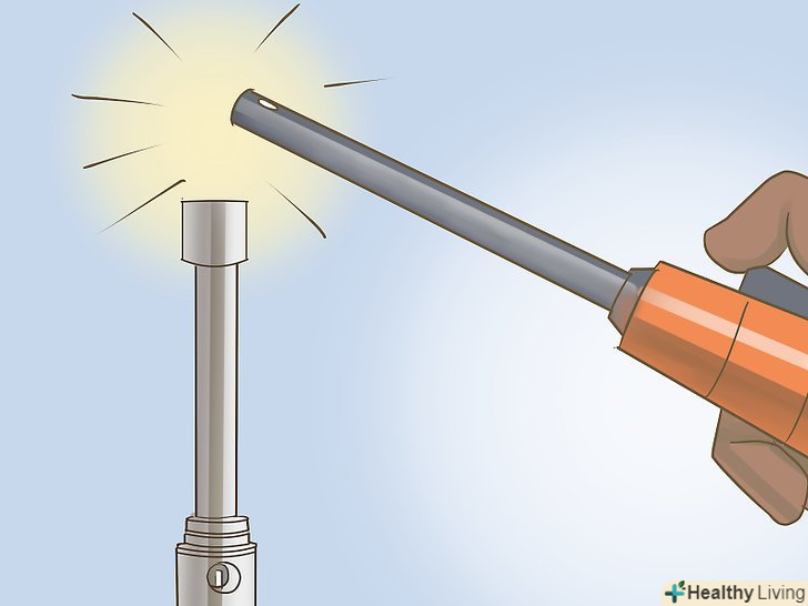 Піднесіть запальничку до верхнього отвору трубки і підпаліть газ.Тримайте крісло або запальничку в 3-5 сантиметрах над отвором трубки пальника. Натисніть на кресало, щоб висікти іскру, і приберіть її, як тільки з'явиться полум'я.[12]- Якщо ви ніколи не користувалися кріслом, потренуйтеся висікати іскру, перш ніж намагатися запалити пальник.