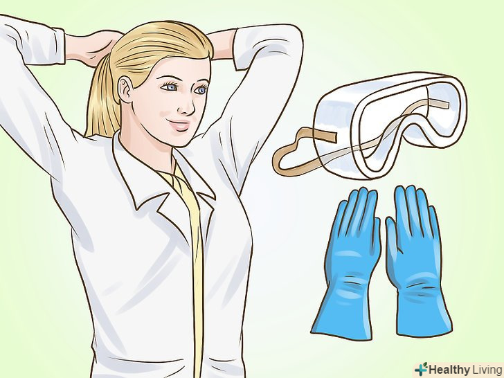 Використовуйте засоби захисту і приберіть звисають волосся або одяг.на додаток до захисних окулярів і рукавичок переконайтеся, що ваш одяг безпечний. Зав'яжіть ззаду довге волосся, подоткніте або зніміть звисають предмети одягу і прикраси.[2]- При роботі в лабораторії завжди надягайте закрите взуття.