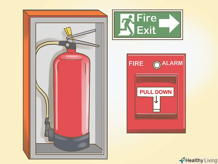 Визначте, де знаходиться обладнання для забезпечення безпеки, пожежна сигналізація та аварійні виходи.перш ніж запалювати пальник, дізнайтеся, де розташований аварійний вихід, знайдіть аварійний вимикач подачі газу і пожежну сигналізацію. Перевірте, чи є протипожежні засоби, такі як вогнегасники та пісок.[3]