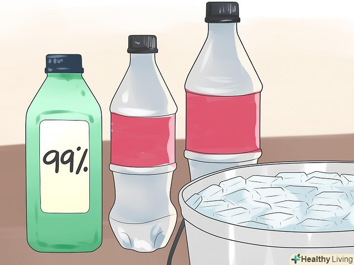 Зберіть всі потрібні матеріали.вам знадобиться: пластикова пляшка ємністю 2 літри, пляшка поменше, яка може поміститися всередині великої пластикової пляшки, ножиці, 99% ізопропіловий спирт, гранули сухого льоду.- Обидві пляшки повинні бути порожніми, чистими і сухими. Якщо ви приберете етикетки на пляшках, то зможете спостерігати за процесом створення низькотемпературного спирту.