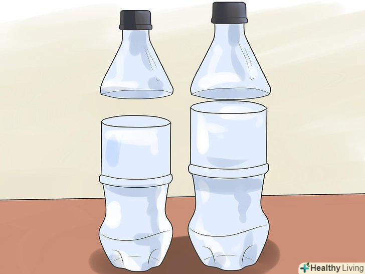 Підготуйте пляшки.ножицями відріжте близько 7,5 см від верхньої частини обох пляшок. Верхівки вам більше не знадобляться.- Переконайтеся, що маленька пляшка легко поміщається у велику.