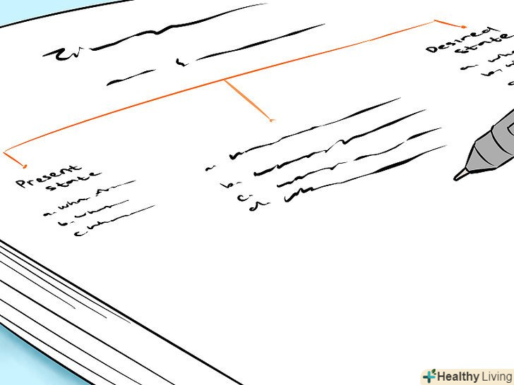 На лівому кінці лінії напишіть "сьогодні", а на правому кінці"бажаний стан". на лівому кінці якомога детальніше опишіть ваше поточне положення. Запитайте себе наступне:- Що я роблю зараз?