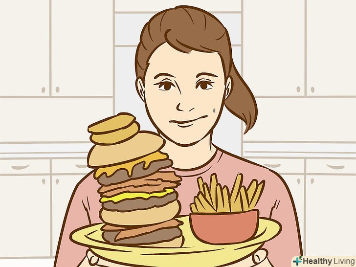 З'їжте максимально велику порцію їжі за 22 години до змагання.постарайтеся з'їсти стільки, скільки це фізично можливо, за один раз. Вибирайте низькокалорійні продукти з високим вмістом клітковини. Поїжте не менше, ніж за 18 годин до початку змагання.[13]- Можна піти в буфет з салатами з необмеженими порціями і продовжувати їсти до тих пір, поки не відчуєте дискомфорт. Але не змушуйте себе ковтати їжу — це шкідливо для здоров'я.