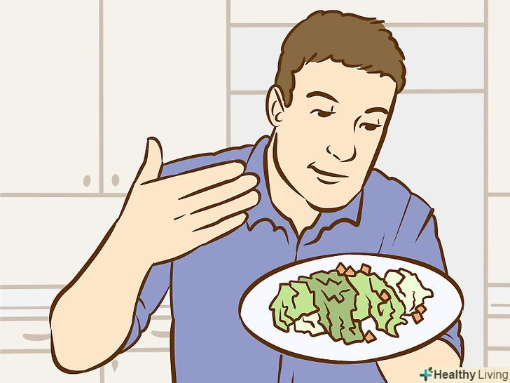 Тренуйтеся їсти низькокалорійні страви з великим вмістом клітковини.якщо для перемоги потрібно буде з'їсти максимальну кількість їжі, вам потрібно буде заздалегідь розтягнути шлунок. Почніть їсти великі кількості низькокалорійної їжі з великим вмістом клітковини, після якої буде швидко відчуватися насичення.[7]- Те, як багато вам потрібно буде з'їсти, залежить від ваших параметрів тіла і змагання. Деяким учасникам конкурсів з поїдання їжі вдається з'їсти кілька кілограмів сирих або свіжих овочів за раз під час тренувань.[8]