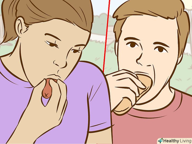 Навчіться ковтати великі шматки їжі, щоб їсти швидше. Почніть тренуватися з водою. Наберіть в рот побільше води, закиньте голову назад і дозвольте силі тяжіння допомогти вам проковтнути воду. Збільшуйте кількість води до тих пір, поки не зможете набирати повний рот води і ковтати її всю відразу. Тренуйтеся кожен день.[6]- Коли у вас почне виходити цей трюк з водою, спробуйте ковтати м'які продукти (наприклад, рис або кіноа). Потім можна буде переходити до більш складним продуктам (наприклад, до стейку). Будьте обережні і не поспішайте, щоб не вдавитися.