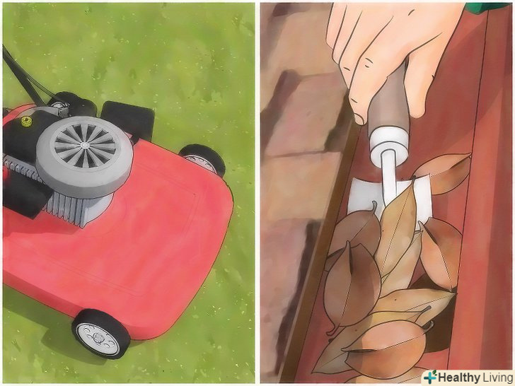 Слідкуйте за станом свого двору.регулярно підстригайте траву у дворі, прополювати будь-які бур'яни і прибирайте будь накопичився сміття. Якщо у вас є місце для вогню з ямою, переконайтеся, що в ямі не скупчилася стояча вода.[16] те ж саме стосується будь-яких інших об'єктів, де вода може накопичуватися після дощу – такі місця є справжнім раєм для комарів.[17] постарайтеся обладнати газони так, щоб ніде не було сирих місць, де може накопичуватися вода.- Регулярно підстригайте траву.