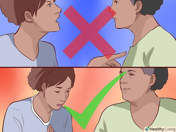 Уникайте перебільшень. якщо ваша мати егоїстична, то, можливо, ви буквально вважаєте її самим егоїстичним людиною в світі, який руйнує ваше життя. Навіть якщо це здається правдою, ви досягнете більшого успіху в розмові з матір'ю, якщо уникнете гіпербол і надмірно емоційної мови.[33]- Наприклад, уникайте фраз наступного виду:"твій егоїзм псує моє життя". Замість цього скажіть щось спокійне і врівноважене: "у мене виникають труднощі в спілкуванні з друзями, коли ти не дозволяєш мені брати твою машину навіть у вихідні". Факти залишаються тими ж, але фраза стає менш обвинувальною і засуджувальною, тому може отримати кращий відгук.