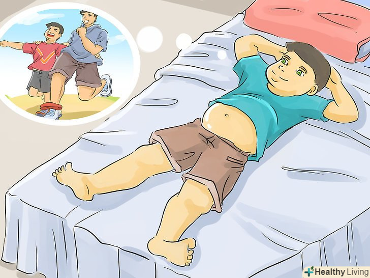 Задовольняйте свої фізичні потреби.організм важливий не менше, ніж психічне та емоційне здоров'я. Можливо, в останні дні ви втратили апетит і не можете заснути. Намагайтеся їсти три рази на день, нехай навіть невеликими порціями. Пийте багато води, щоб не допускати зневоднення. Якщо не вдається заснути, то приймайте розслаблюючу ванну перед сном і відмовтеся від кофеїну після обіду.[10]- Не забувайте про фізичні навантаження! Фізкультура сприяє виділенню ендорфінів-гормонів, які покращують настрій. Займайтеся фізкультурою не менше 30 хвилин три рази на тиждень. Спробуйте почати хоча б з піших прогулянок по району.