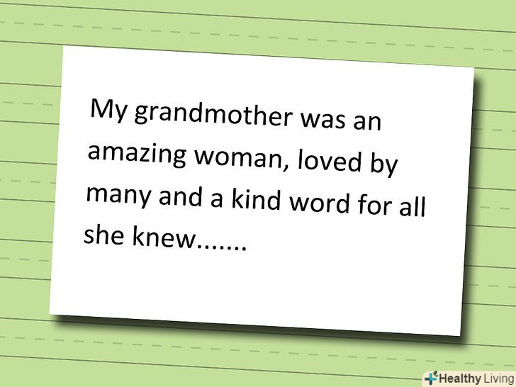 Можете навіть створити тему.висловіть деяку думку про те, що уособлює вашого родича, і орієнтуючись на це, вибирайте, які спогади та історії увійдуть у вашу промову. Наприклад, якщо ви відчуваєте, що більшість людей знають бабусю і дідуся за розповідями з дитинства, ви можете поділитися парою моментів, коли ви слухали історії ваших бабусі і дідусі.