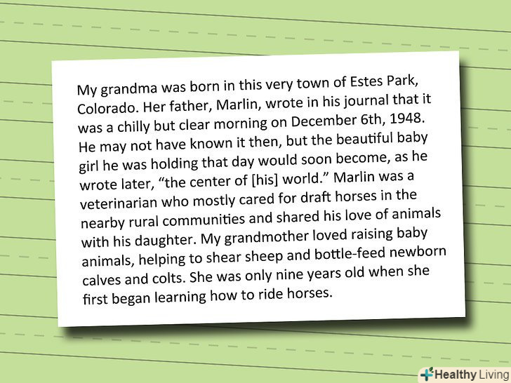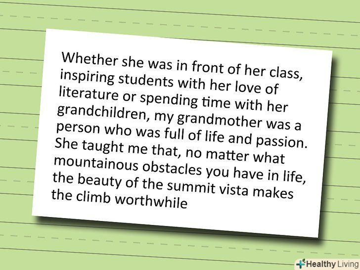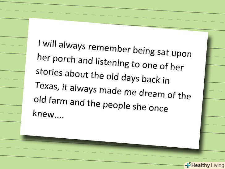 Згадайте якісь історії, які ілюструють кращі якості вашого близького.наприклад, якщо ваш дідусь ніколи не забував зателефонувати в особливих випадках, це характеризує його як людину відповідальну. Якщо ваш дідусь допомагав вам з домашніми завданнями і проектами, це показує, що він був освіченою людиною і хорошим вчителем.- Запитайте членів вашої родини, що вони пам'ятають про померлого. Можливо, ви забули якусь цікаву історію або важливий спогад. Можливо, є щось з Вашого раннього дитинства, про що теж можна згадати в своїй промові.