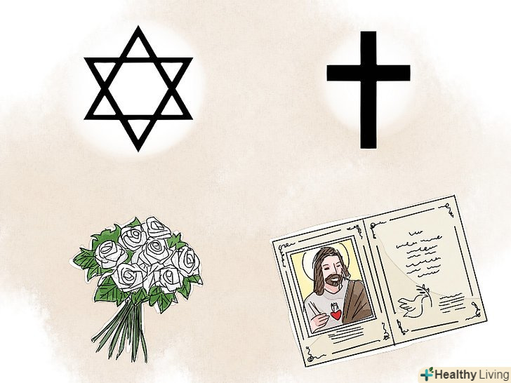 Дізнайтеся заздалегідь про те, які релігійні обряди можуть проводитися на похоронах.у деяких випадках людина може опинитися на релігійній похоронній церемонії, навіть не маючи уявлення про те, які обряди будуть проводитися під час церемонії. Щоб уникнути незручних ситуацій, проведіть невелике дослідження, пов'язане з майбутнім відвідуванням таких похоронів. Наприклад, у євреїв не прийнято покладати на могилу квіти або вінки.[9] у католиків прийнято відправляти запрошення на месу.[10]
