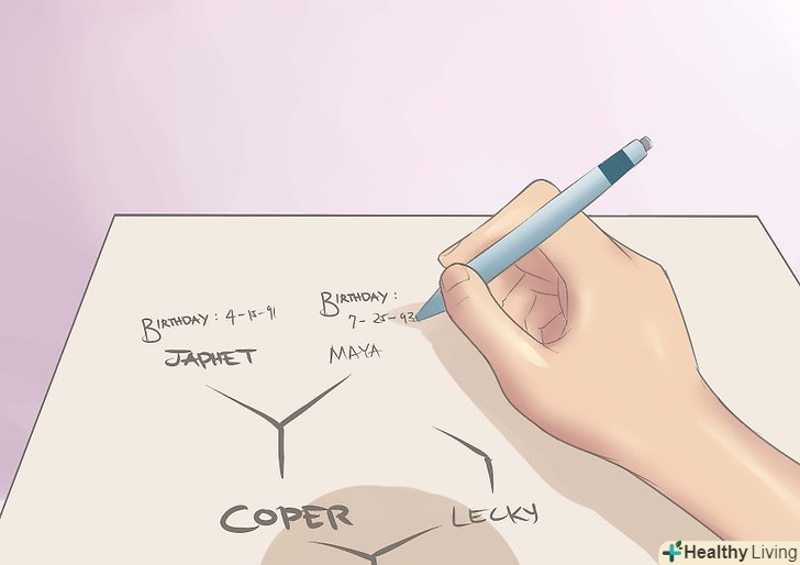 Вирішіть, яку інформацію ви хочете висунути на перший план.на додаток до Імен і прізвищ вашої родини ви можете перерахувати дати народження, дати смерті (якщо такі є), дати шлюбу і так далі. Наявність цих дат в родоводі зробить її ще більш інформативною, як Історичний документ вашої родини. На додаток до дат ви можете включити місця народження або рідні міста своїх родичів.