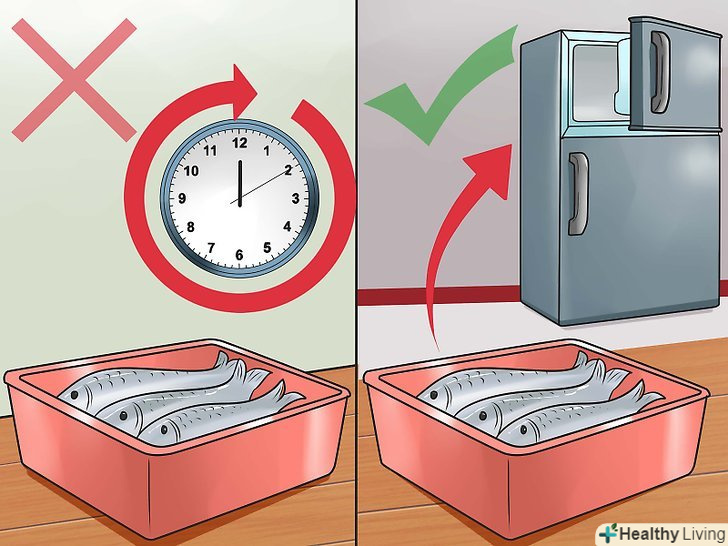 Розморожуйте рибу в холодильнику.якщо у вас заморожена риба, не розморожуйте її, залишивши її на столі. Замість цього помістіть рибу під холодну воду, поки вона не розморозиться, або залиште її на ніч в холодильнику.