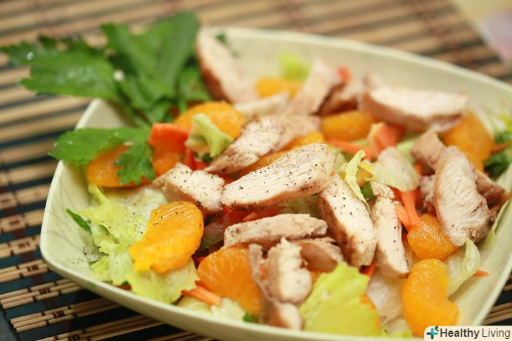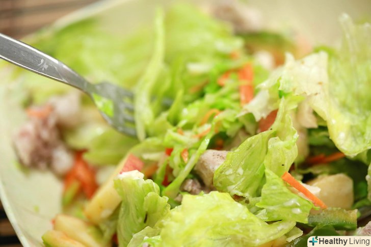 Включайте в свій раціон салати. Робіть різноманітні салати. Включайте зелені листові овочі (салат ромен, шпинат, капуста, рукола, мангольд), а також всіма улюблені овочі (морква, помідори, брокколі, перець, капуста, гриби, селера). Заправляйте салати пікантними соусами. Крім того, ви можете додати м'ясо курки, нут або лосось. Це відмінні джерела білка.