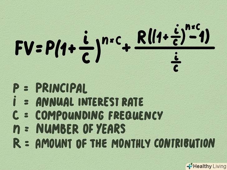 Вивчіть формулу.складні відсотки зростатимуть ще швидше, якщо ви будете регулярно збільшувати суму вкладу, наприклад, щомісяця вносити певну суму на депозитний рахунок. Застосовувана в такому випадку формула стає більше, але заснована на тих же самих принципах. Вона виглядає наступним чином:[7]. Всі змінні у формулі залишаються тими ж, але до них додається ще один показник: