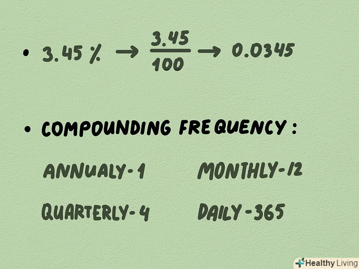 - Також вам буде необхідно дізнатися частоту капіталізації відсотків. Зазвичай капіталізація відбувається щорічно, щомісяця або щодня. Припустимо, що у вашому випадку капіталізація щомісячна. Тобто частота капіталізації ("c") дорівнює 12.