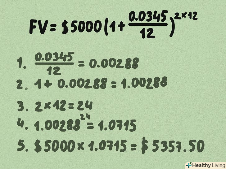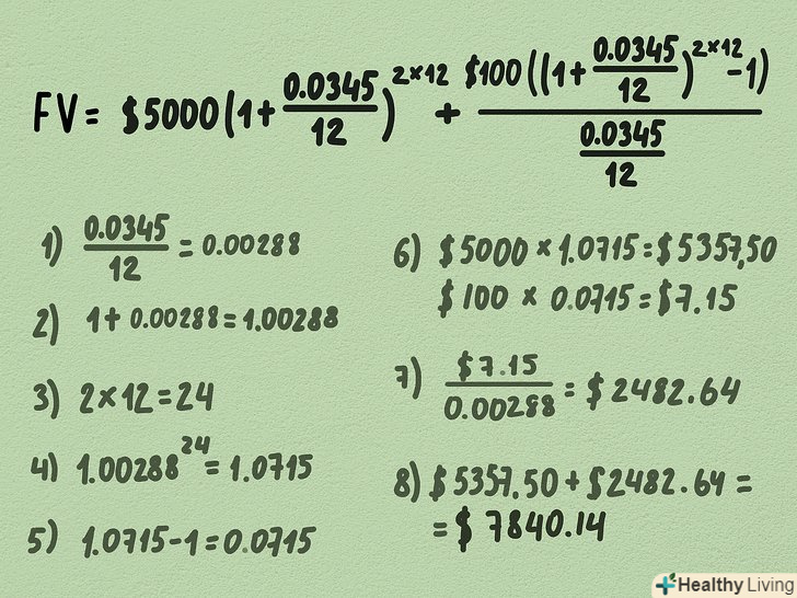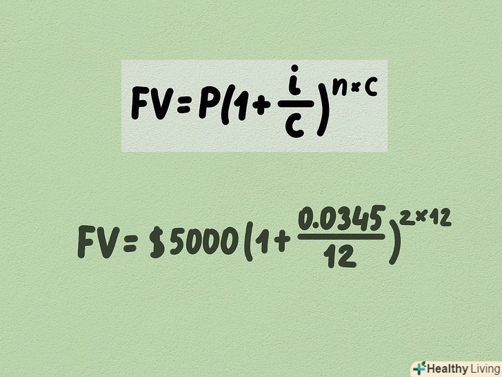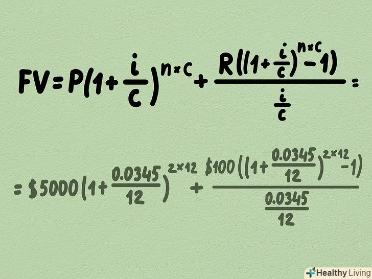 Підставте дані в формулу.в продовження вищевказаного прикладу, припустимо, що ви вирішили щомісяця поповнювати вклад на суму $100. При цьому первісна сума вкладу становить $5000, ставка дорівнює 3,45% річних, а капіталізація відбувається щомісяця. Розрахуємо зростання депозиту за два роки.- Підставте у формулу свої дані: