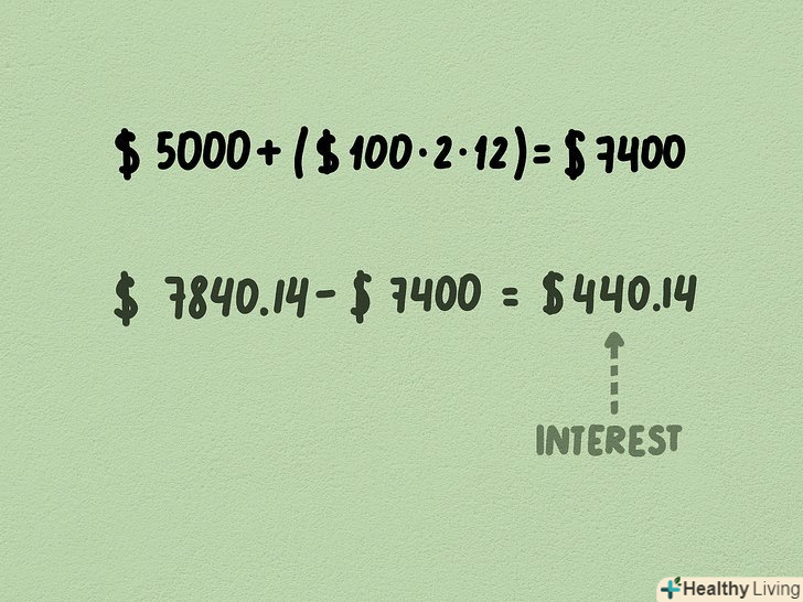 Відніміть з результату величину початкового вкладу і суму поповнень.щоб дізнатися, скільки ж відсотків ви заробили, необхідно відняти з підсумку суму коштів, які ви внесли на рахунок. Для цього спочатку складіть початковий депозит у розмірі $5000 і добуток загального числа поповнень (2 роки*12 місяців=24) на їх величину ($100 на місяць), або $2400. Підсумкова сума $5000 і $2400 складе $7400. Відніміть $7400 з майбутньої вартості інвестиції $7840,14, і ви отримаєте суму нарахованих відсотків, яка складе $440,14.