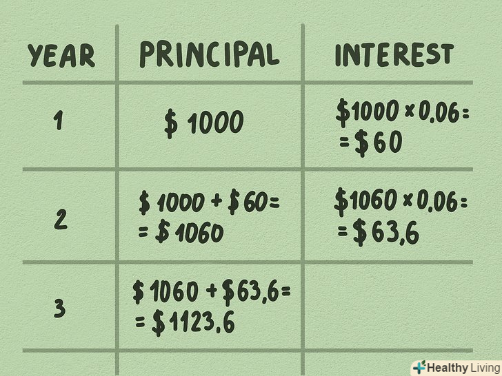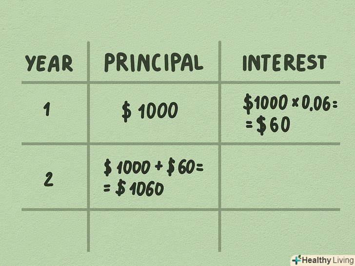 - Без капіталізації відсотки по другому році складатимуть $60 ($1000 * 6% = $60). Насправді, відсотки за кожен рік будуть рівні $60, якщо вони не зараховуються до основної суми. Іншими словами, це прості відсотки.
