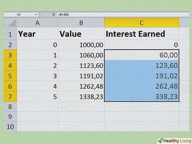 - Поставте нуль у комірці C2. У клітинку C3 введіть формулу "=B3-b$2 " і натисніть клавішу введення. Так ви отримаєте різницю між поточною і первісною вартістю інвестиції (осередками B3 і B2), яка являє собою загальну суму нарахованих відсотків. Клацніть по нижньому правому куті осередку C3 і розтягніть формулу до осередку C7. Суми розрахуються автоматично.
